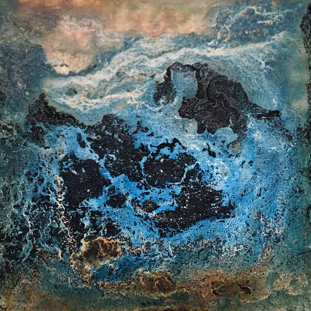 L’obra s’estructura entorn d’una massa pictòrica central de tons blaus intensos i negres texturitzats, que semblen expandir-se des del nucli cap als marges. La part superior està travessada per una gamma d’ocre i beix que suavitza el contrast i aporta una sensació de cel, terra o superfície mineral. La interacció entre matèria líquida i sòlida es fa present tant en la composició com en la tècnica, amb zones que semblen erosionades o en procés de dissolució. El conjunt suggereix un estat de transformació constant, com si l’aigua i la pedra intercanviessin les seves naturaleses.