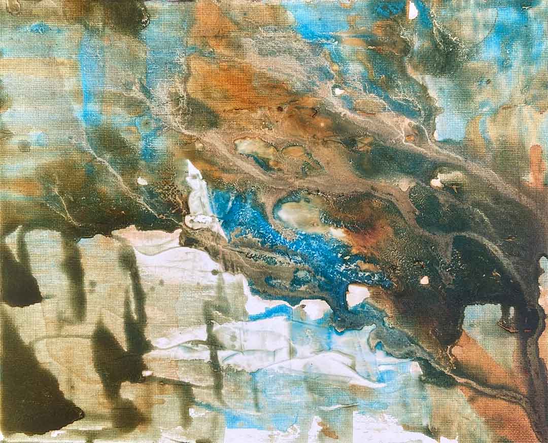 Els tons grisosos, platejats i verdosos es combinen amb una zona central de textures cristal·lines, com si alguna cosa estigués a punt d’emergir des del subsòl visual.