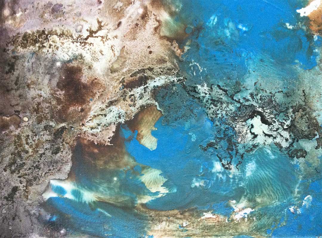 Esta obra nos sumerge en una especie de cartografía emocional abstracta, donde pigmentos terrosos, aguas turquesas y texturas orgánicas se disuelven en un movimiento casi geológico. El azul intenso evoca océanos interiores, recuerdos líquidos, mientras que las zonas más densas y erosionadas parecen contener sedimentos de tiempo, memoria y materia antigua.