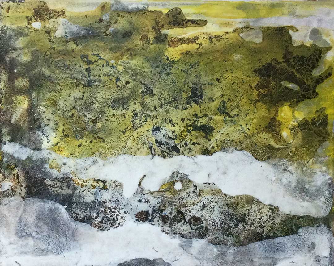 La obra se estructura a partir de una amplia gama de ocres, amarillos y blancos, con zonas donde la materia pictórica se acumula generando texturas de aspecto geológico. Las formas no son definidas, pero remiten a estratos, tierras erosionadas o superficies orgánicas vistas desde la distancia. Una franja blanca atraviesa el plano visual, introduciendo un corte de luz o vacío entre capas de densidad. La imagen se mueve entre lo mineral y lo atmosférico, sugiriendo un territorio en transformación, detenido en una vibración suspendida.